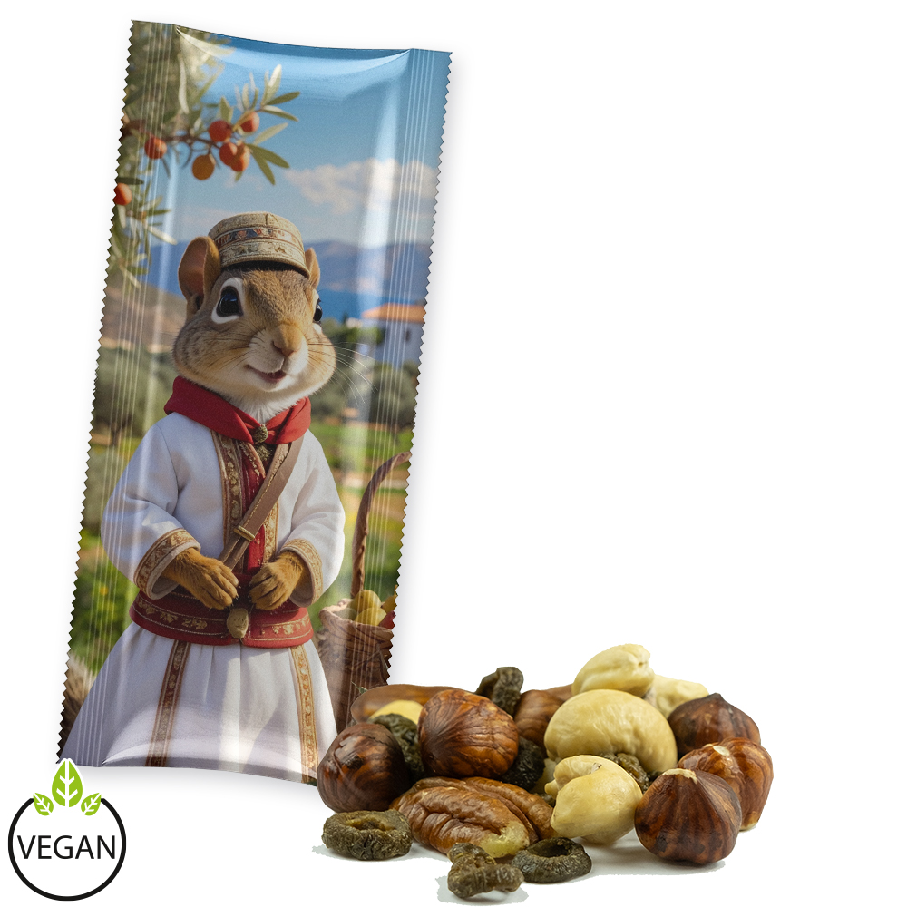 Ein besonderer Snack mit mediterranem Flair. Unser NussMix vereint ausgewählte Nüsse mit fein getrockneten Oliven zu einer aromatischen Komposition, die Urlaubsfeeling aufkommen lässt. Mit knackigen Mandeln, Cashews, Haselnüssen sowie Pekannüssen und der würzigen Note sonnengereifter Oliven sorgt diese Mischung für ein einzigartiges Geschmackserlebnis. Perfekt für alle, die den mediterranen Lebensstil lieben und Wert auf bewussten Genuss legen. Ob als Snack für unterwegs, im Büro oder als edles Giveaway - dieser Mix bringt den Geschmack des Südens direkt zu Ihren Kunden!